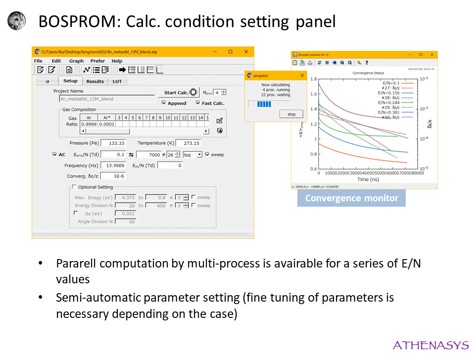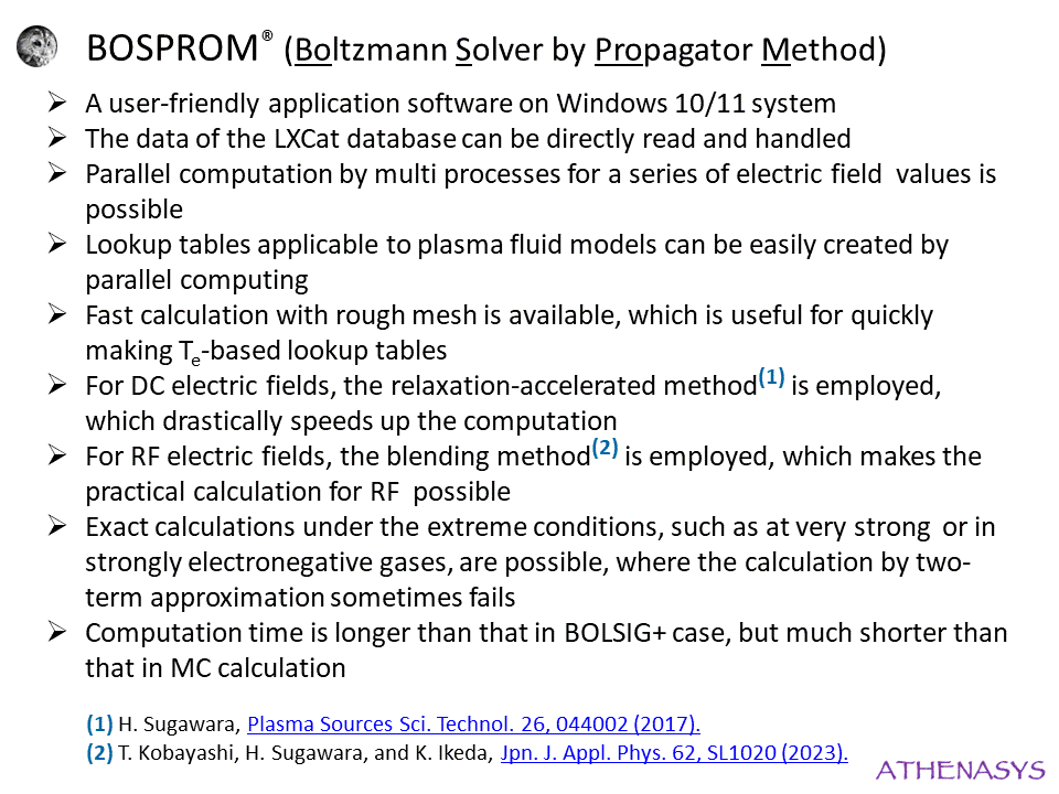 With the help of Prof. Sugawara, we have extended the calculation code to be more versatile and developed a graphical user interface (GUI). A newly developed improved calculation method (blending method) has also been included. Details are described in this paper (the accepted manuscript can be freely downloaded from here, the HUSCAP collection of Hokkaido University Library). This new computer program has been named BOSPROM® (BOltzmann Solver by PROpagator Method). With this new tool, the LUT for plasma simulations is easily created.
