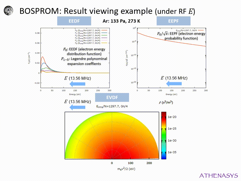Figure 8 shows an example of the oscillating EEDF (electron energy distribution function), EEPF (electron energy probability function), and EVDF (electron velocity distribution function) under the RF (13.56 MHz) electric field in Ar gas.