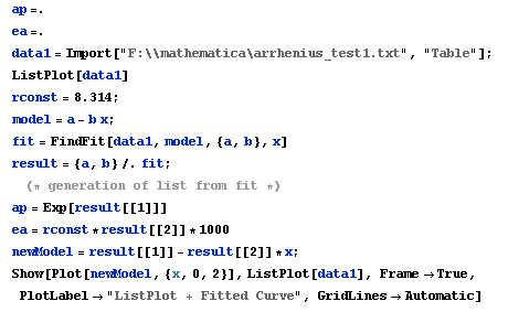 この例では,予め対数をとって整理された text file を読み込み,FindFit と呼ぶ関数を用いてフィッティングを行っています.そして,result という配列の中に取り込んだ結果から,頻度因子と活性化エネルギーを計算して算出しています.